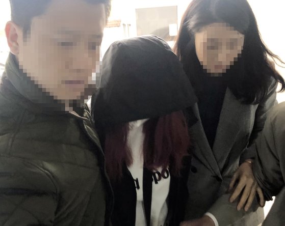 30일 오전 광주 동부경찰서에 의붓딸 살해사건에 공모한 것으로 드러난 친모(가운데)가 긴급체포돼 압송되고 있다. [연합뉴스]